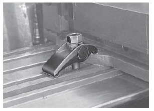 锻制可调压板压持住铣床工作台上的液压台虎钳一边。