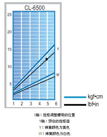 CL-6500为例,其最大和最小扭矩分别为2 Lbf•in (3 Kgf•cm)14 Lbf•in (16 Kgf•cm)当扭矩螺栓旋紧至#5时,使用黄色弹簧的CL-6500起子的扭矩是约为13kgf•cm。不过从扭矩曲线图查询都是预估值,并不是真正的扭矩正确值,所以跟实际会有一定的误差,正确的方法是使用测试扭矩计来测试起子空转时的扭矩,这才是此起子真正的扭矩值。